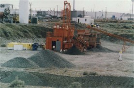 The pilot plant utilized at this site had a throughput capacity of 10-15 tons per hour in a mobile, easily erectable configuration. The plant consisted of a feed hopper, a double-deck wet screen, hydrocyclones, attrition scrubber, sand dewatering screen, sludge thickening and dewatering units, and the required supporting peripheral equipment. The pilot study was successful in meeting the goal of >90% reduction by weight and was also successful in achieving the specified test performance standards.